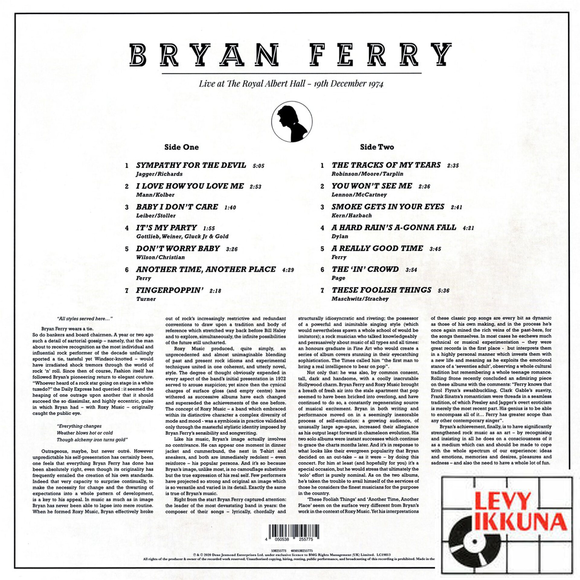 The songs on "Bryan Ferry: Live At The Royal Albert Hall 1974" include the Rolling Stones original "Sympathy For The Devil", "Don't Worry Baby" by the Beach Boys, the Bob Dylan classic "A Hard Rain's A-Gonna Fall", Ike Turner's "Fingerpoppin'" and many more.