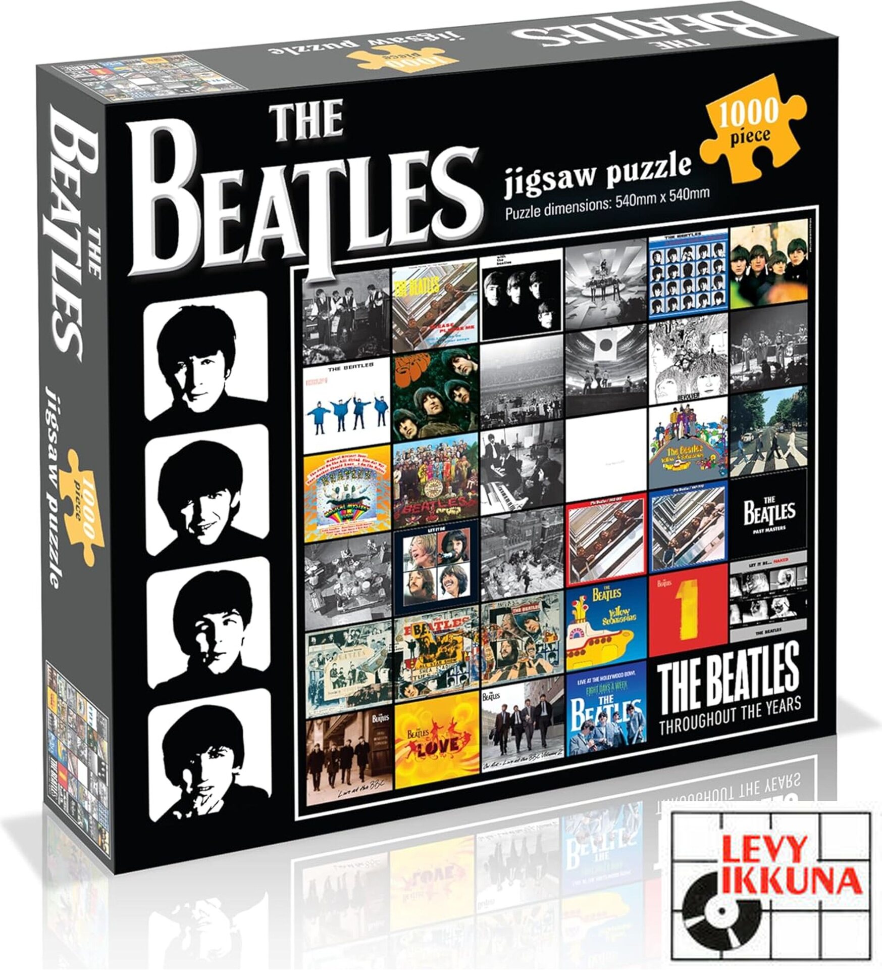 Time for some Beatlemania! For any Beatles fan, this fun and challenging Beatles Album Covers 1,000 piece Puzzle will be a must have! The Beatles, an English rock band formed in Liverpool in 1960, whose best-known line-up comprised John Lennon, Paul McCartney, George Harrison and Ringo Starr, are regarded as the most influential band of all time. This eye-catching 1,000 piece puzzle of a collage of some of the World-famous rock band’s most treasured album covers includes the famed Abbey Road, Let It Be, Yellow Submarine, Help and Sergeant Pepper’s Lonely Hearts Club album artwork. This puzzle makes an ideal gift for any Beatles fan age 12 years and over. The finished puzzle measures 590mm x 590mm.