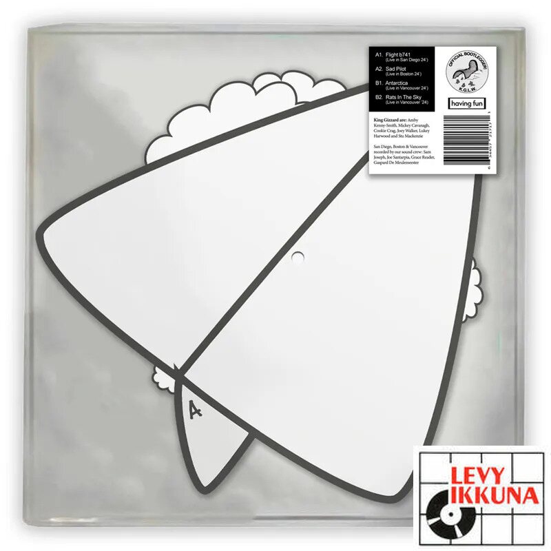 Having Fun Records has made a paper airplane shaped King Gizzard and the Lizard Wizard record for Record Store Day. The four song album is inspired by the band's Flight b741 and incorporates songs from various live recordings as part of the band's Bootlegger series.