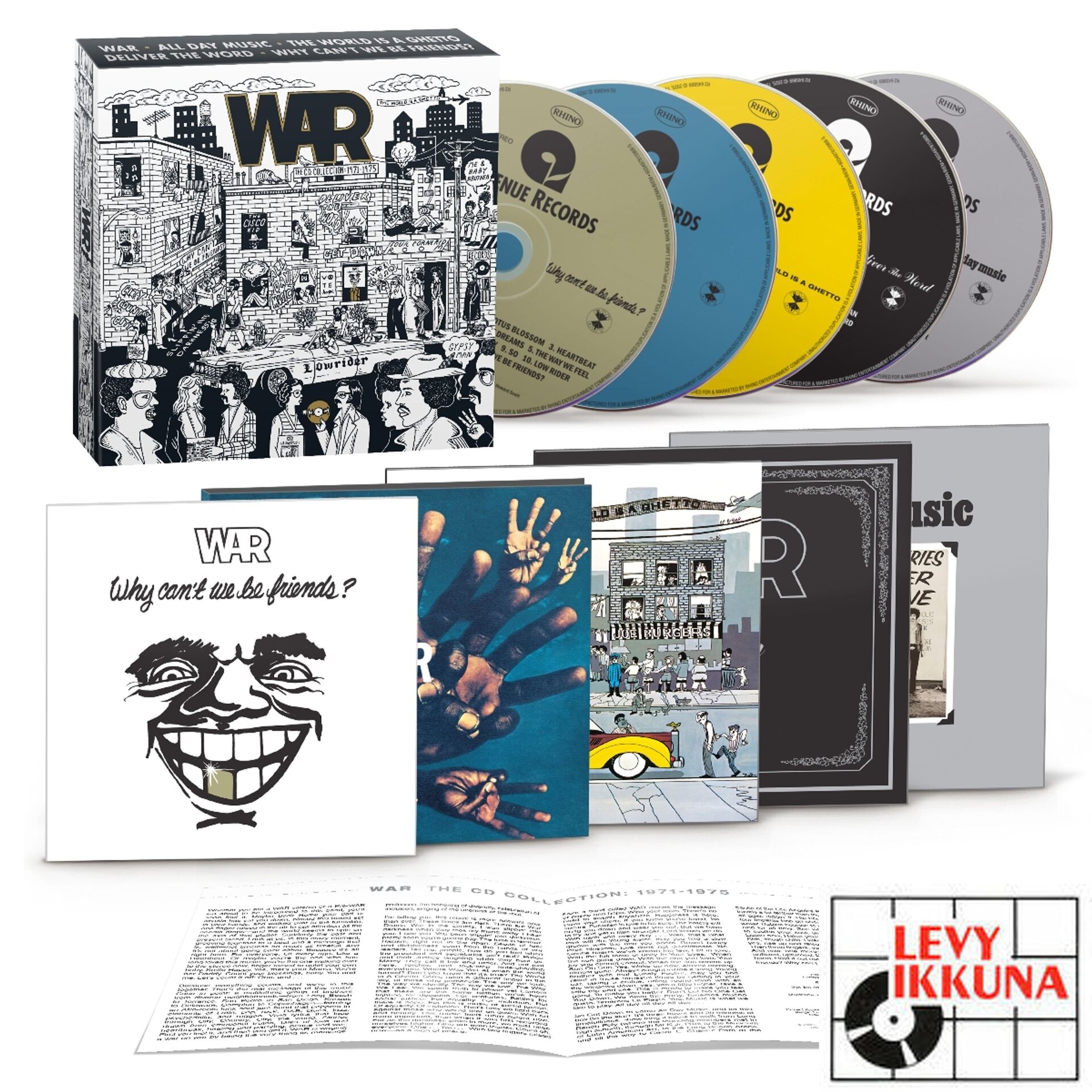 The CD Collection 1971-1975 is the five-disc CD Box set that follows the 2021 Record Store Day vinyl exclusive featuring the same line up. This set joins previous releases from the overarching ‘Collection’ series of special edition products celebrating WAR’s 50+ years of music making. Sharing the same tracklist of newly remastered songs and brand new original artwork from famed illustrator Dave Van Patten, The CD Collection includes five of the band’s early classic albums, recorded after the departure of their former lead-singer Eric Burdon: WAR (1971), All Day Music (1971), The World Is A Ghetto (1972), Deliver The Word (1973), and Why Can’t We Be Friends? (1975). WAR’s signature genre-defying sound and style can be heard throughout this stellar collection.