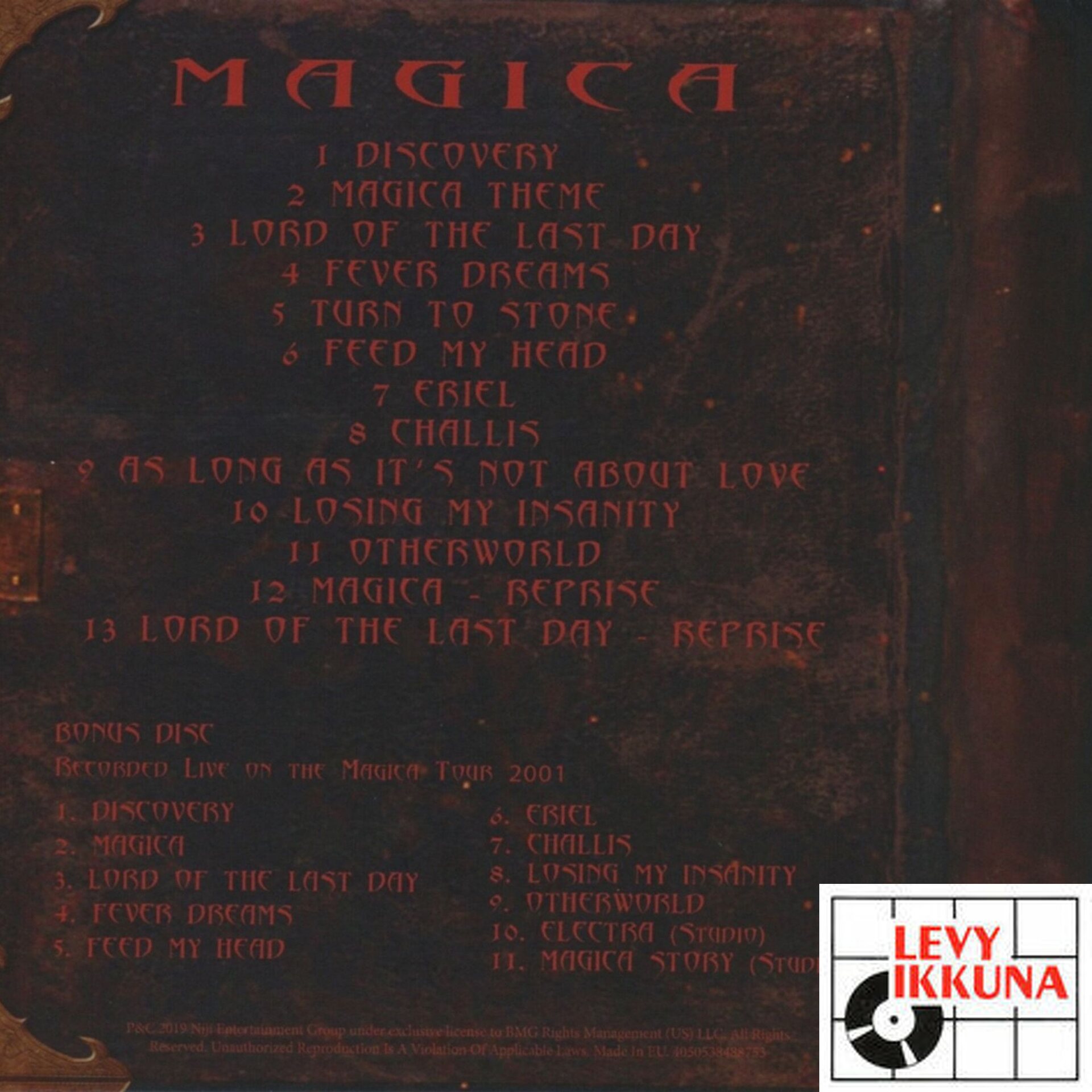 The 2019 remaster CD contains 10 previously unreleased Magica tracks that were performed on tour in 2001.