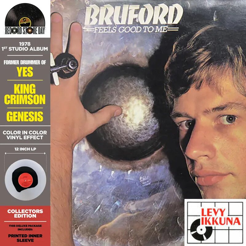 "Prog Rock" drummer Bill Bruford's 1st studio solo album, 1978 - Feels Good To Me formerly of Yes, King Crimson and Genesis. The album features prog rock legends - guitarist Allan Holdsworth, bassist Jeff Berlin, and keyboardist Dave Stewart. all about jazz called the album "a landmark recording" due to "the sheer chemistry between the core members". This deluxe vinyl package includes: OBI side spine, original art work, printed inner sleeve and crystal clear blue vinyl.
