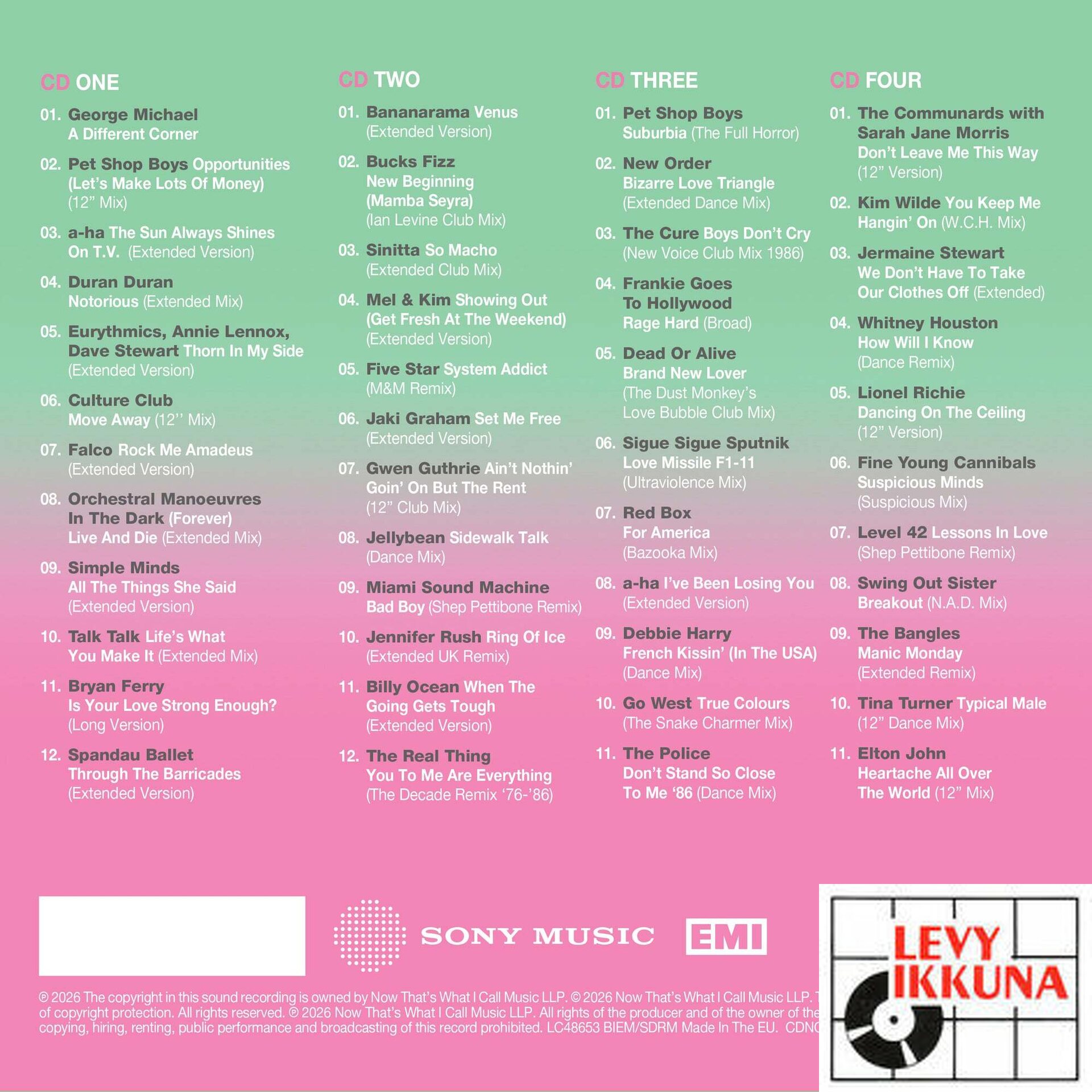 CD3 showcases more of ‘86’s greatest artists and remixes – Opening with the Pet Shop Boys’ epic ‘Suburbia (The Full Horror)’, ahead of New Order’s dancefloor favourite ‘Bizarre Love Triangle’ and The Cure - with the ‘New Voice Club Mix’ of their classic ‘Boys Don’t Cry’. Frankie Goes To Hollywood deliver the expansive brilliance of ‘Rage Hard (Broad)’, plus massive remixes feature from Dead Or Alive, Sigue Sigue Sputnik, and Red Box. a-ha make a second appearance with ‘I’ve Been Losing You’, before disc 3 closes with a trio of standouts from Debbie Harry, Go West, and The Police – the latter revisiting their earlier #1 as ‘Don’t Stand So Close To Me ’86 (Dance Mix)’, recorded to coincide with the band’s #1compilation ‘Every Breath You Take: The Singles’.